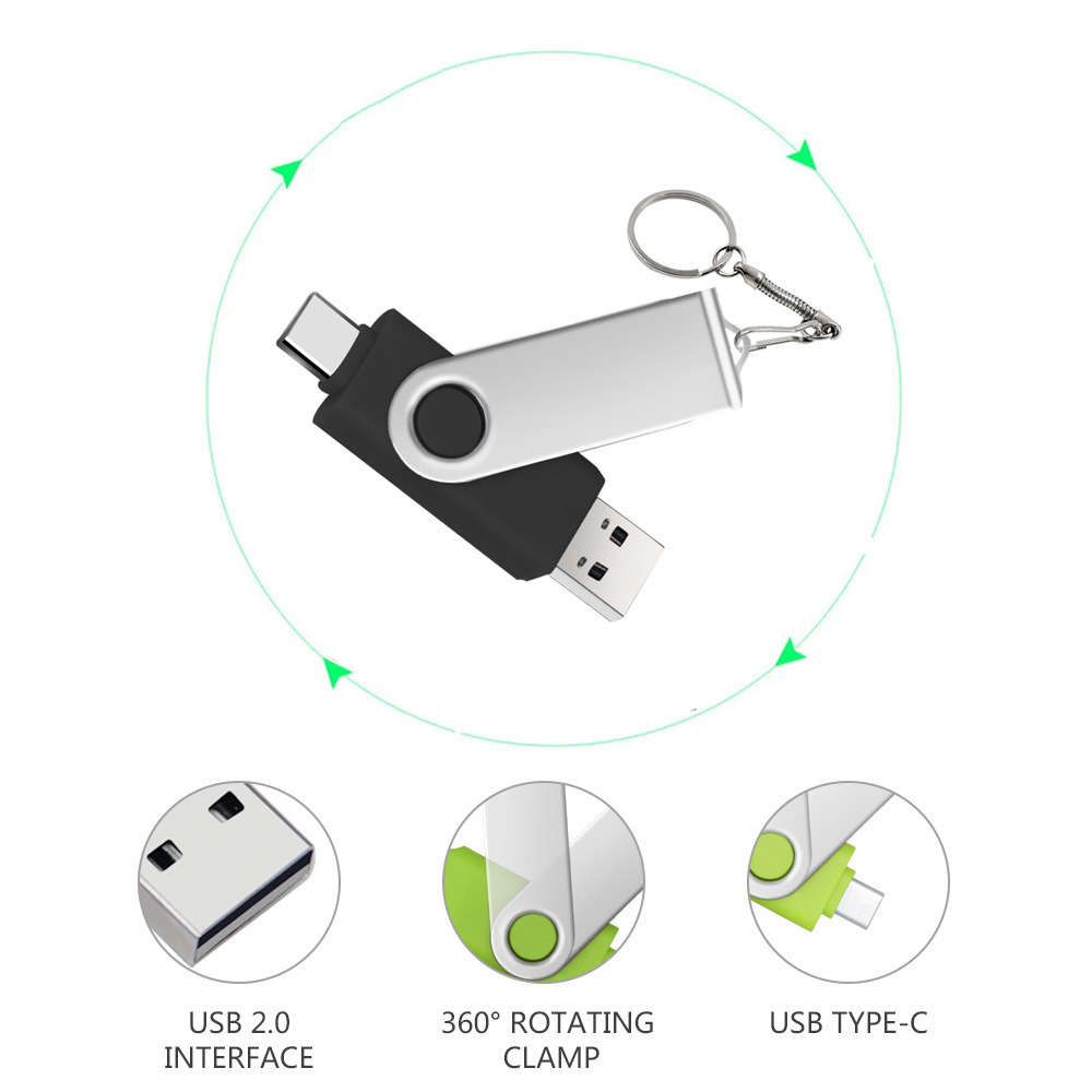 Description: Type-C Two-in-One USB Flash Drive in black, featuring 64G capacity. This versatile drive supports dual-use with computers and mobile phones. It rotates for convenience, offering USB 2.0 connectivity in a sleek, business-ready design.